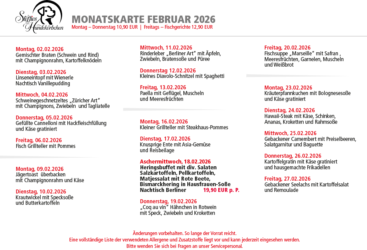 Änderungen vorbehalten. Mittagstisch gibt es solange der Vorrat reicht.
